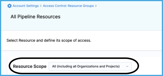 - All Resources Including Child Scopes: Includes all resources within the account's scope, as well as those within the scope of orgs and projects under the account. This is the most inclusive resource group possible.