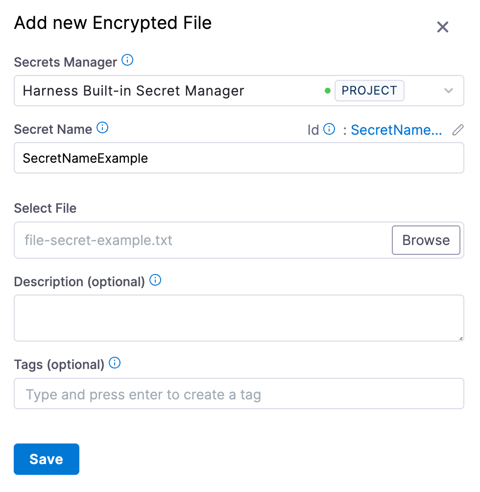 You can use this name to reference the encrypted file secret in pipelines, steps, connectors, and so on.